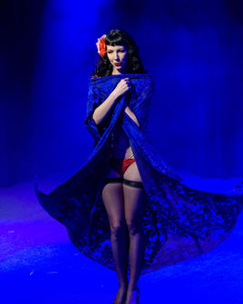 A classic burlesque act filled with sizzle and sass. With a delightful contrast between a dark blue, crushed velvet robe and playful bright red lingerie, "Do I Move You?" asks a questions that audiences are all too happy to answer.